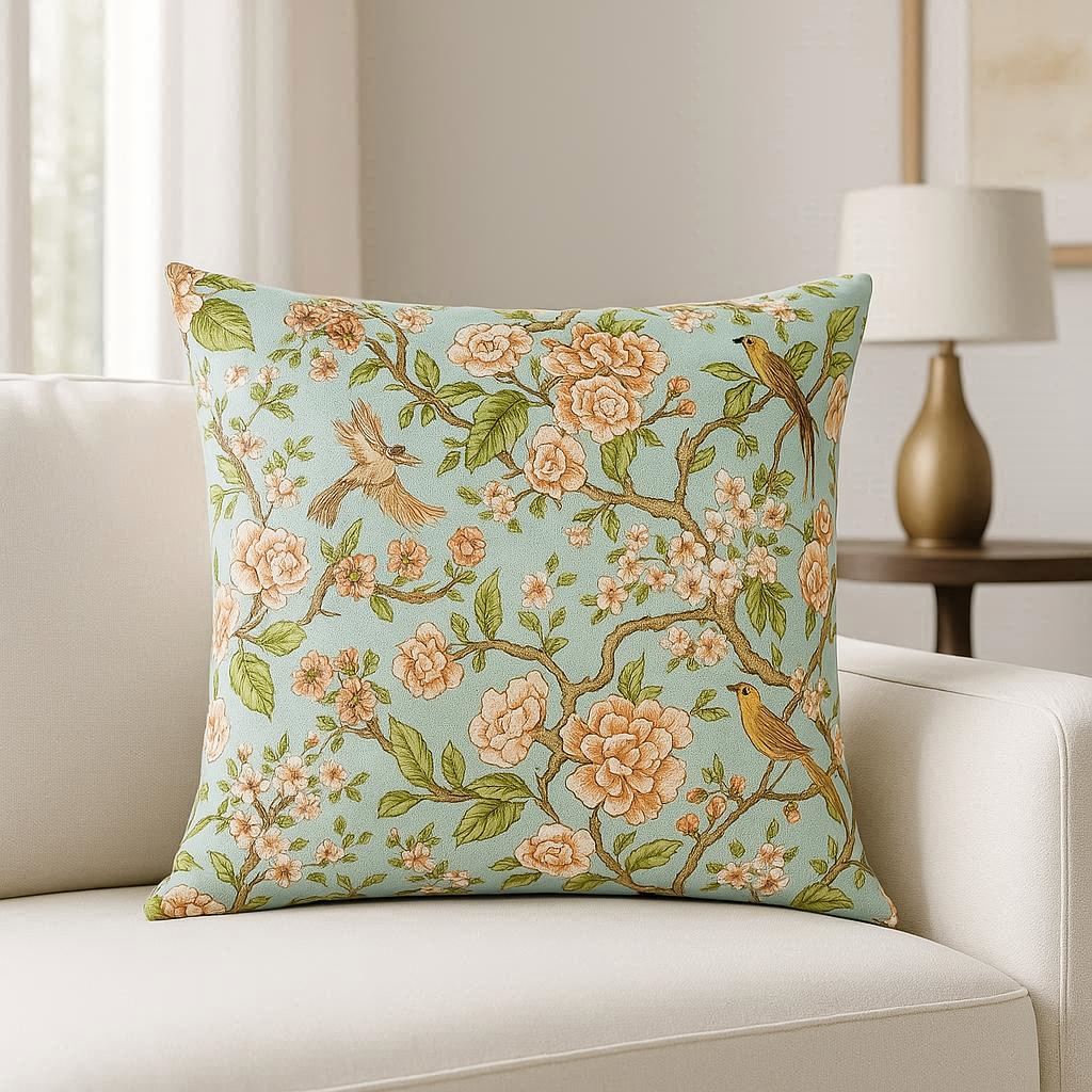 The Charlotte Collection features a floral with birds design in two colors, teal and gold. Soft to the touch and beautiful.
